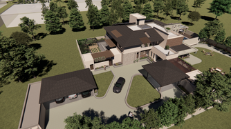 The layout promotes privacy and luxury, with separate wings and multiple balconies extending views across the sprawling site. Elements like the rooftop solar panels, open lawn seating, and vine-covered walkways showcase an eco-conscious design approach. Every detail—from the welcoming entrance driveway to the cozy backyard patio—has been crafted to offer comfort, sustainability, and timeless style, making this residence both a serene retreat and a statement of refined architecture.